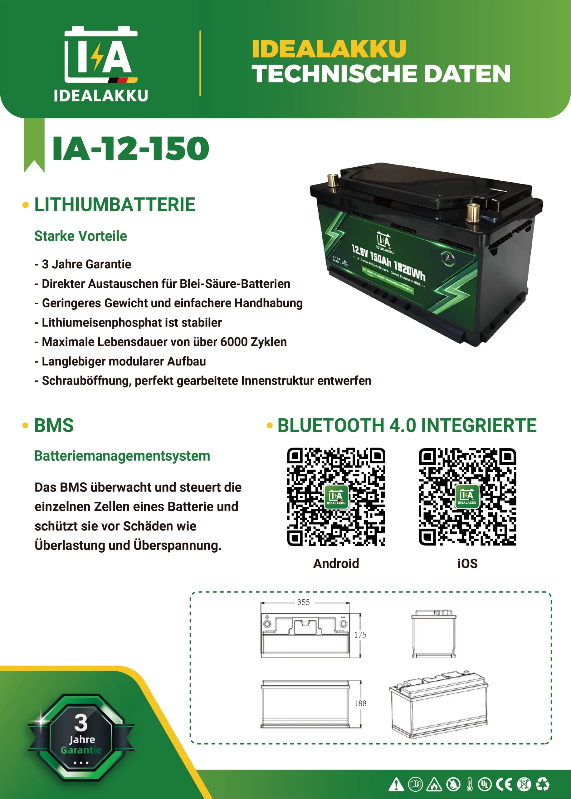 Idealakku IA SERIE Lithium Batterie LiFePO4 12V 150Ah Smart BMS mit Bluetooth Wohnmobil Untersitzbatterie