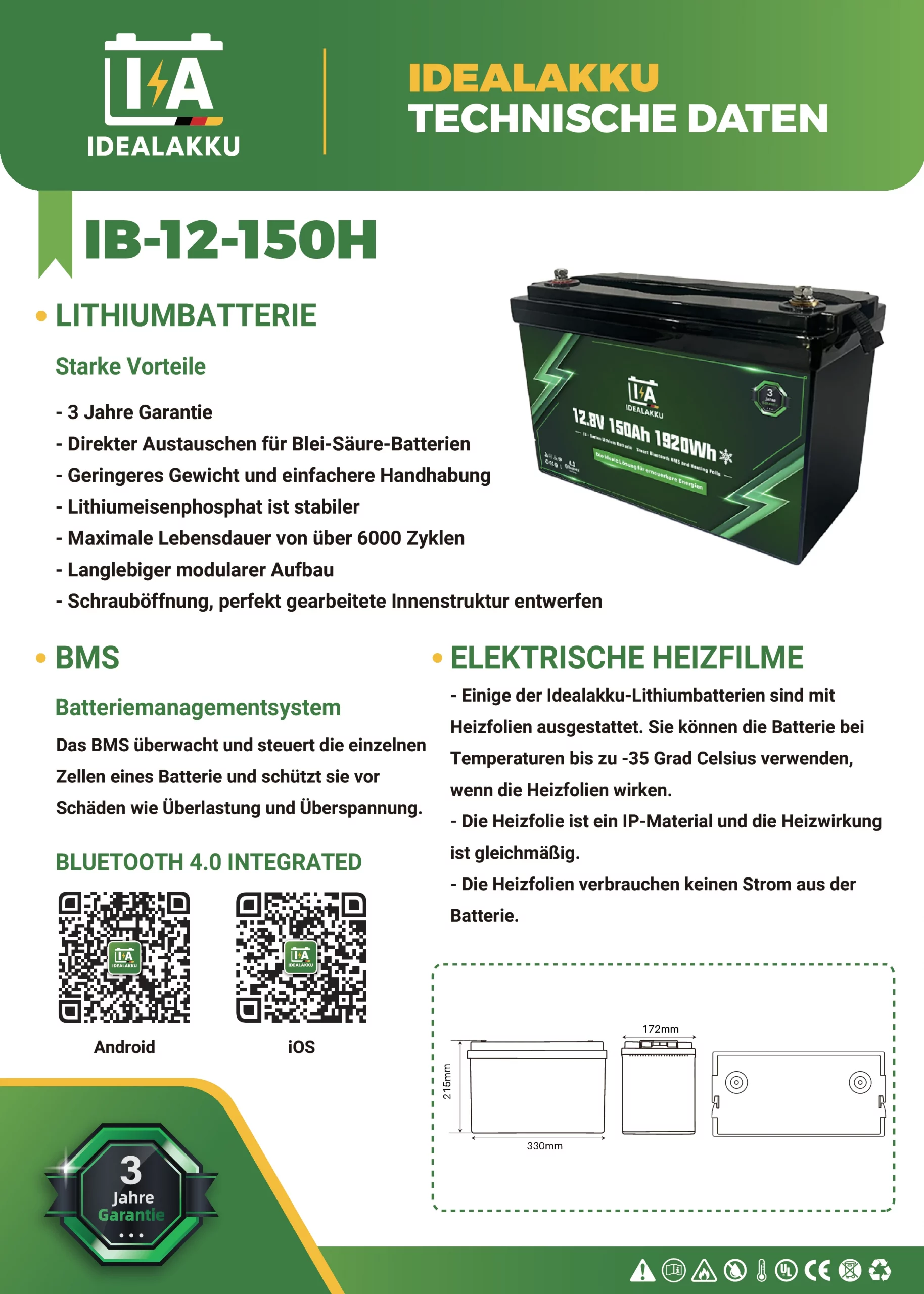Idealakku IB SERIE Lithium Batterie LiFePO4 12V 150Ah Smart BMS mit Bluetooth mit Heizung