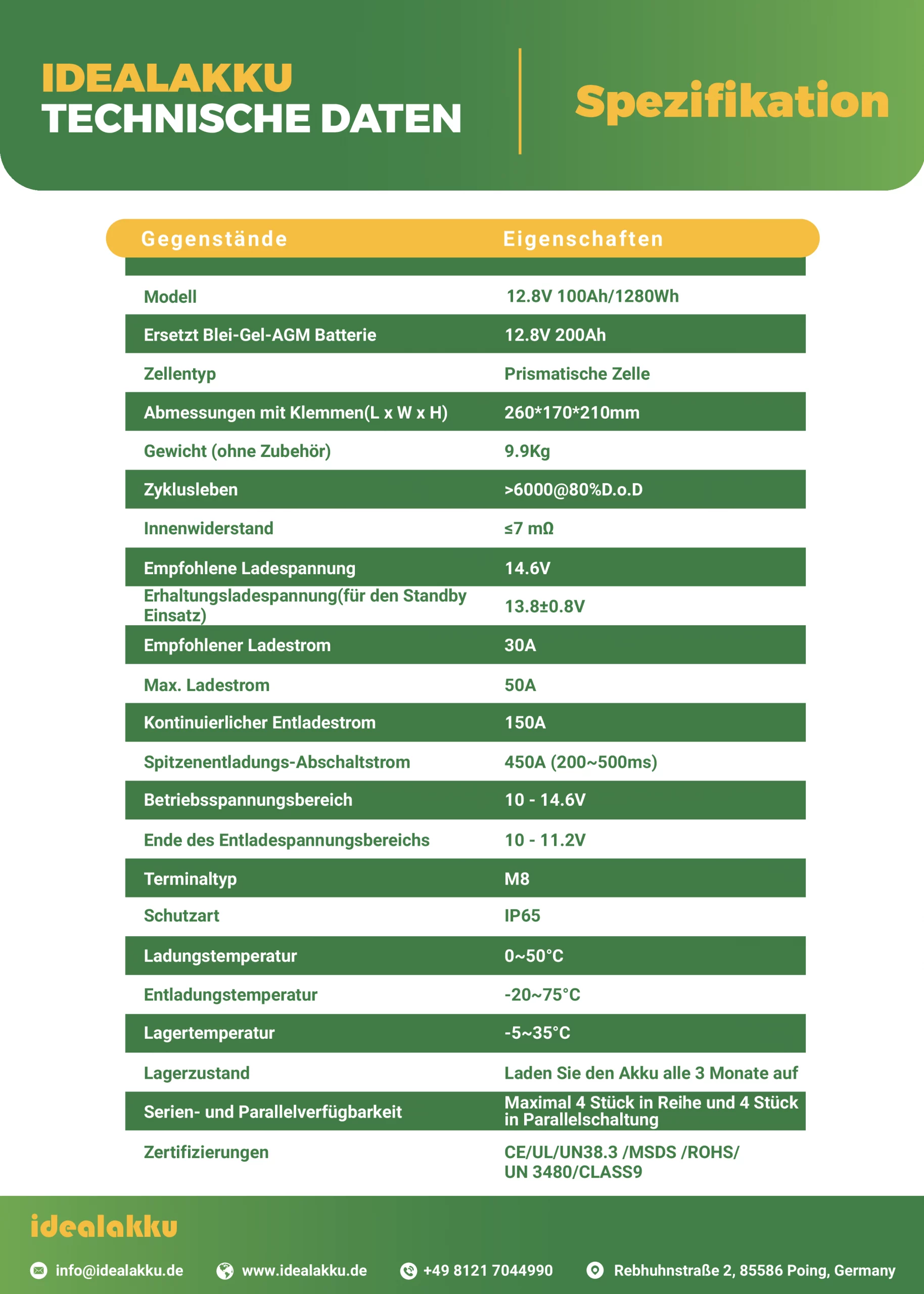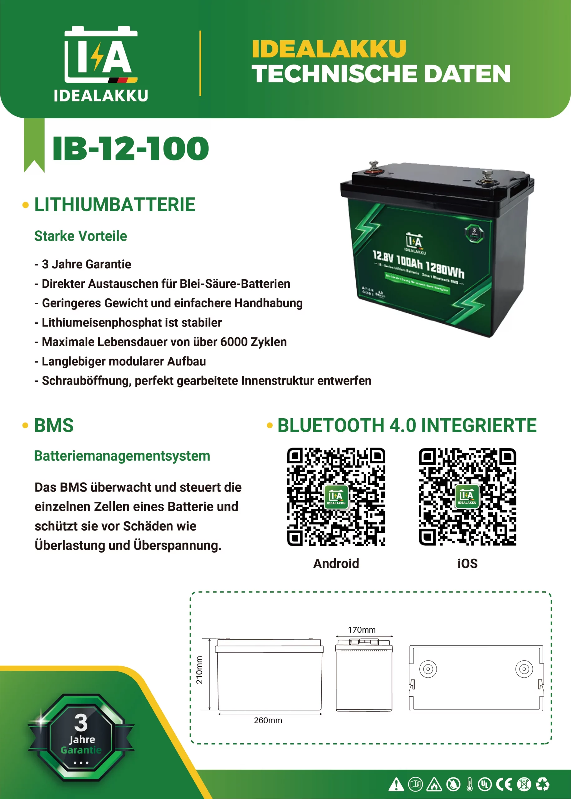 Idealakku IB SERIES Lithium Batterie LiFePO4 12V 100Ah Smart BMS mit Bluetooth