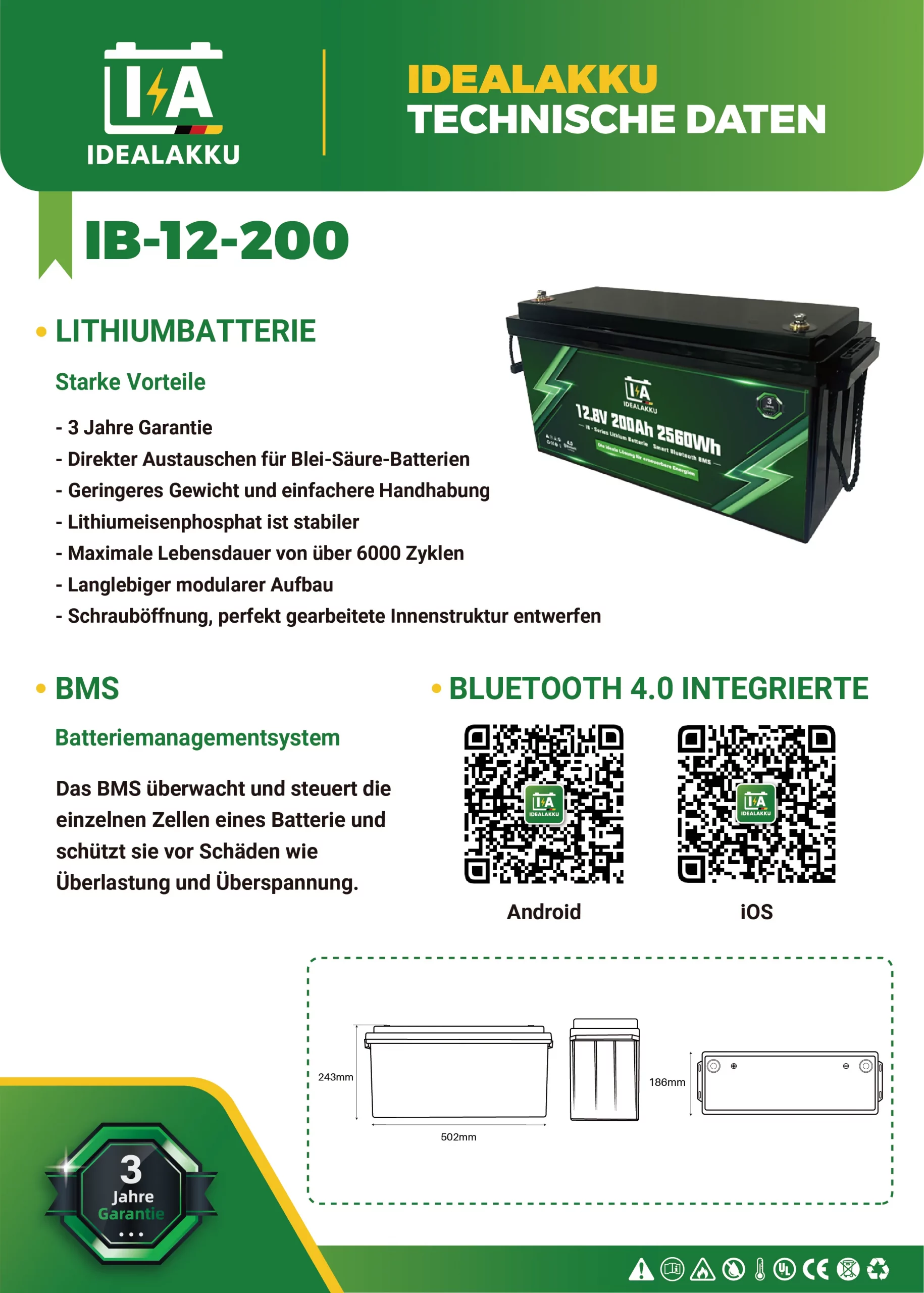 Idealakku IB SERIES Lithium Batterie LiFePO4 12V 200Ah Smart BMS mit Bluetooth