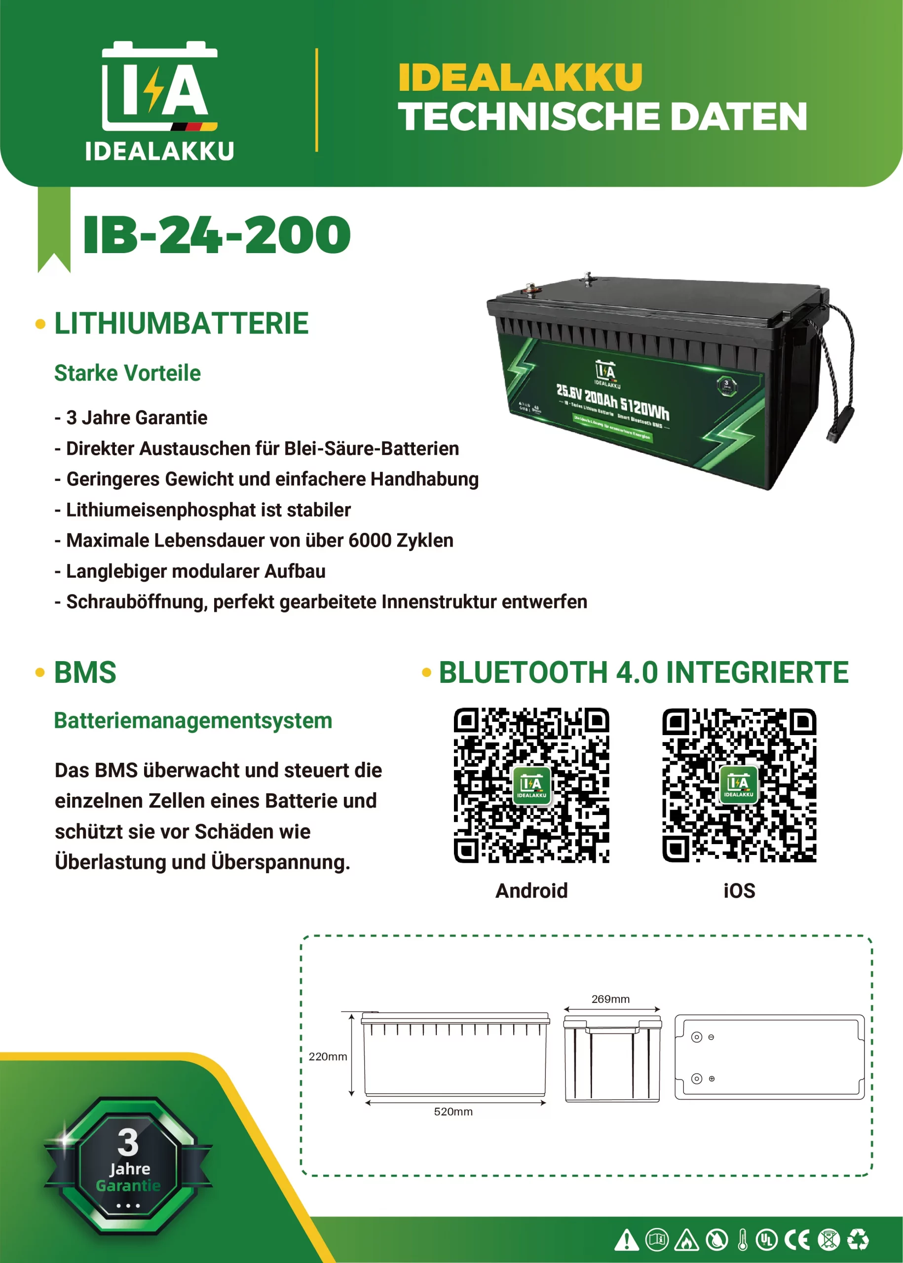 Idealakku IB SERIES Lithium Batterie LiFePO4 25.6V 200Ah Smart BMS mit Bluetooth