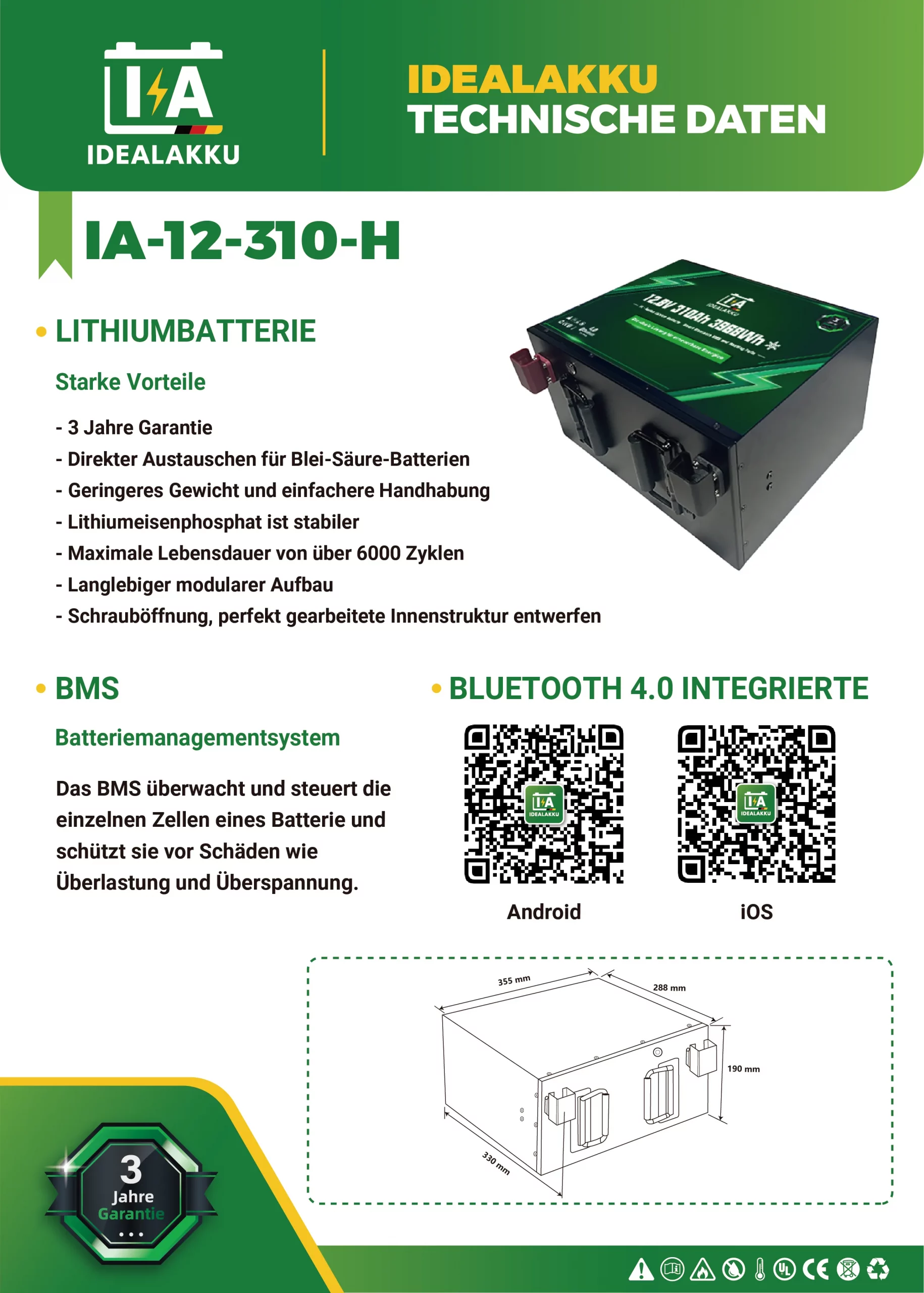 Idealakku Lithium Batterie 310Ah 12V LiFePO4 Untersitz Smart BMS Bluetooth Heizung