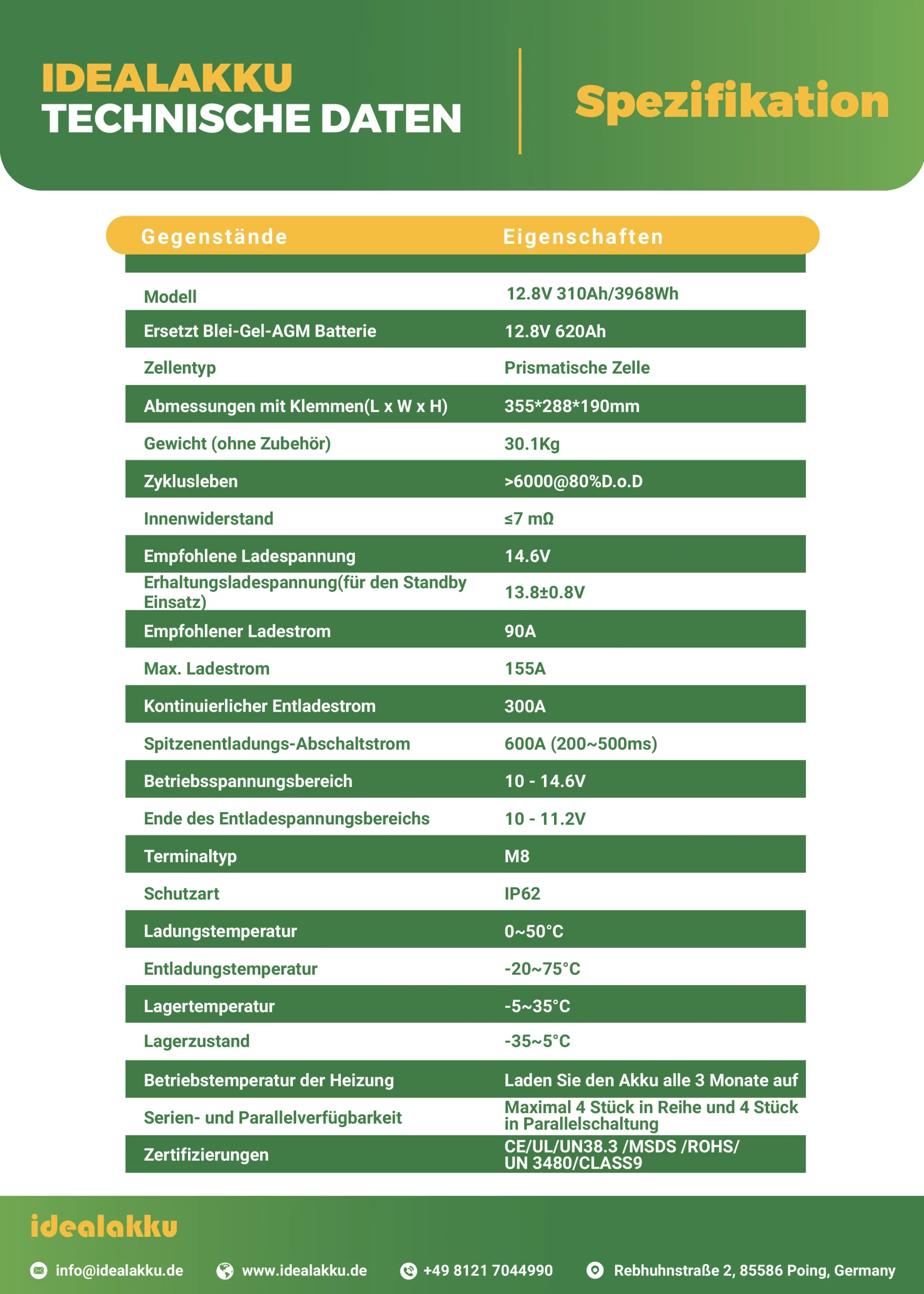Ersetzt Blei-Gel-AGM Batterie | 12.8V 620Ah |