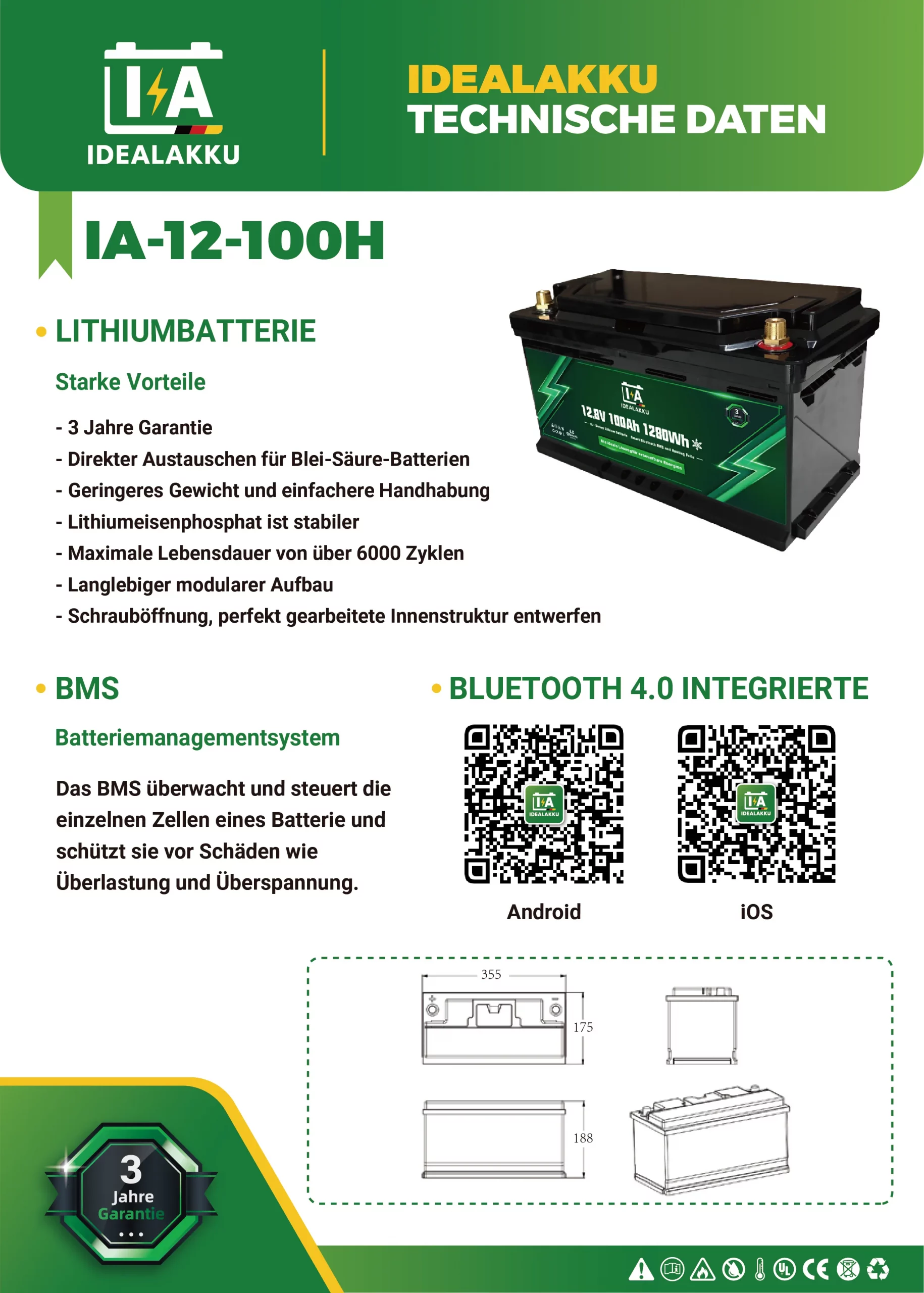 Idealakku IA SERIE Lithium Batterie LiFePO4 12V 100Ah Smart BMS mit Bluetooth Wohnmobil Untersitzbatterie mit Heizung